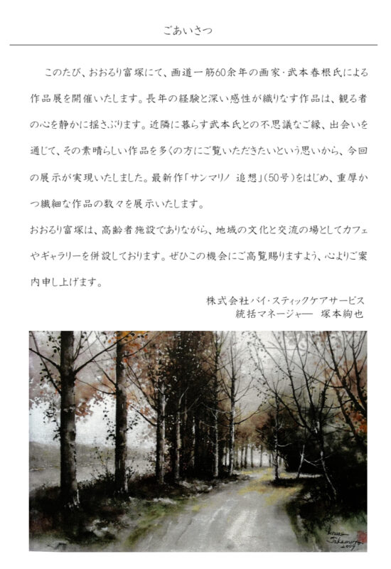 浜松市中央区富塚町のおおるり富塚で、画家 武本春根の作品展を開催することとなりました。